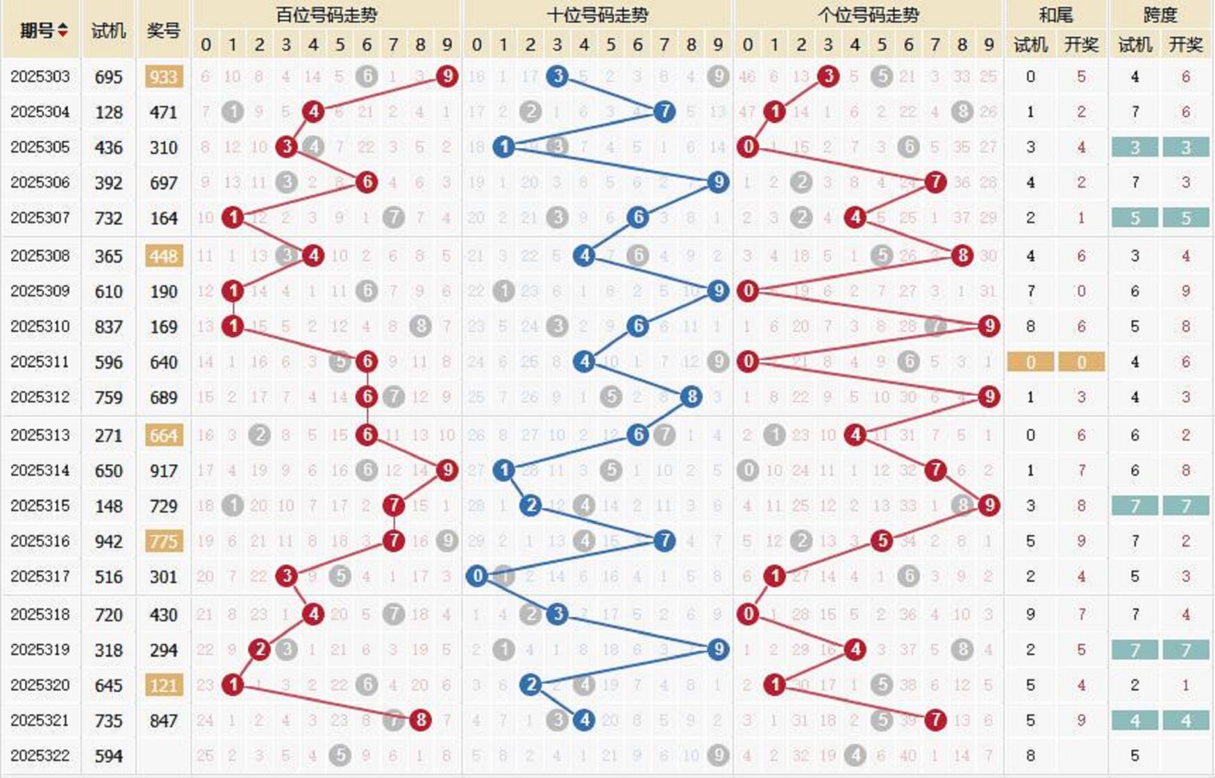 2025322期福彩3D 试 机 号 594 上期开奖号:847 1818部落 关注码:470 金码:7 对应码:223 322试机号形态 试机号:594 和尾:8 跨度:5 大小比:2:1 奇偶比:2:1 试机号走势图 金码历史统计 期数 试机号 关注码 金码 对应码 开奖号 出号 322 594 470 7 223 321 735 438 8 147 847 1 320 645 917 9 799 121 0 319 318 346 3 787 294 0 318 720 094 4 615 430 1 317 516 302 3 011 301 1 316 942 783 7 904 775 0 315 148 863 6 444 729 0 314 650 427 4 191 917 0 313 271 305 5 368 664 0 312 759 193 1 588 689 1 311 596 742 2 055 640 1 310 837 672 7 783 169 0 309 610 594 5 725 190 2 308 365 942 2 172 448 0 307 732 784 8 255 164 0 306 392 407 7 718 697 1 历史出现情况统计 322历史开奖号 2002322期 试机号 904 开奖号 747 和 18 322期牛小妹推荐 独胆:8 双胆:86 三胆:086 杀码:35 六码:014689 百位:01 十位:89 个位:46 直组精选: 084 086 094 096 184 186 194 196 单挑:086 更多精选内容: