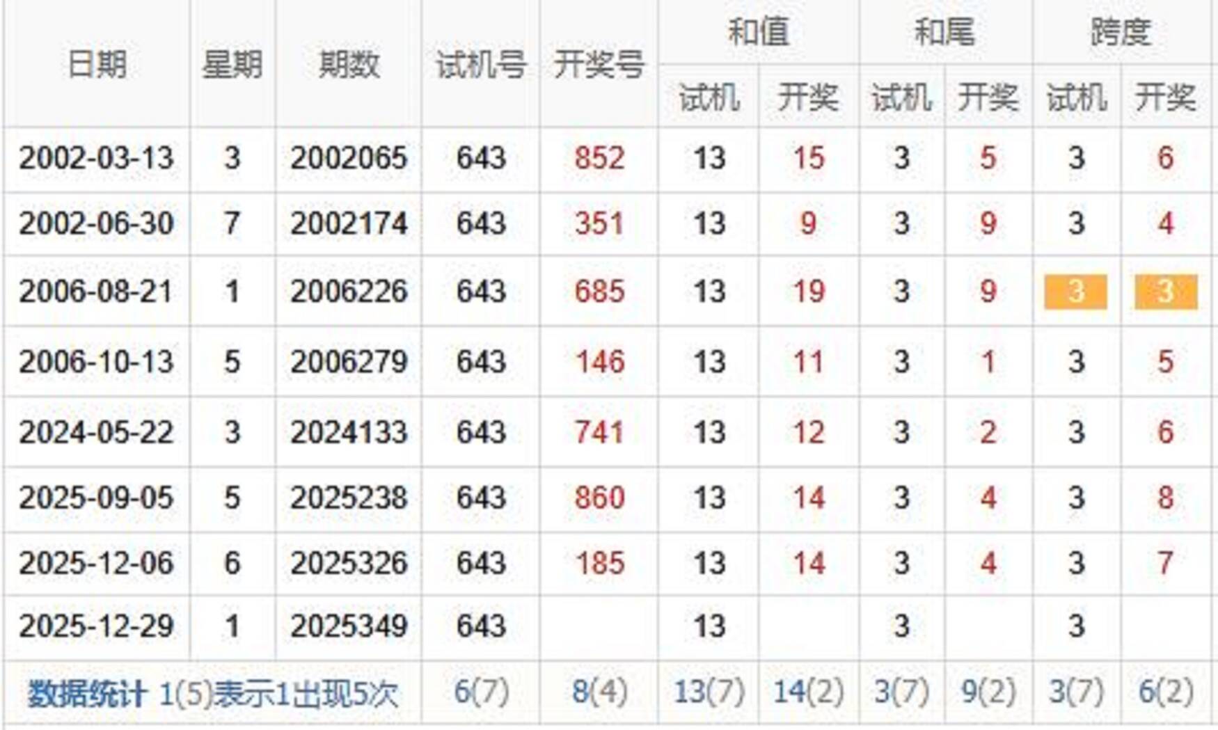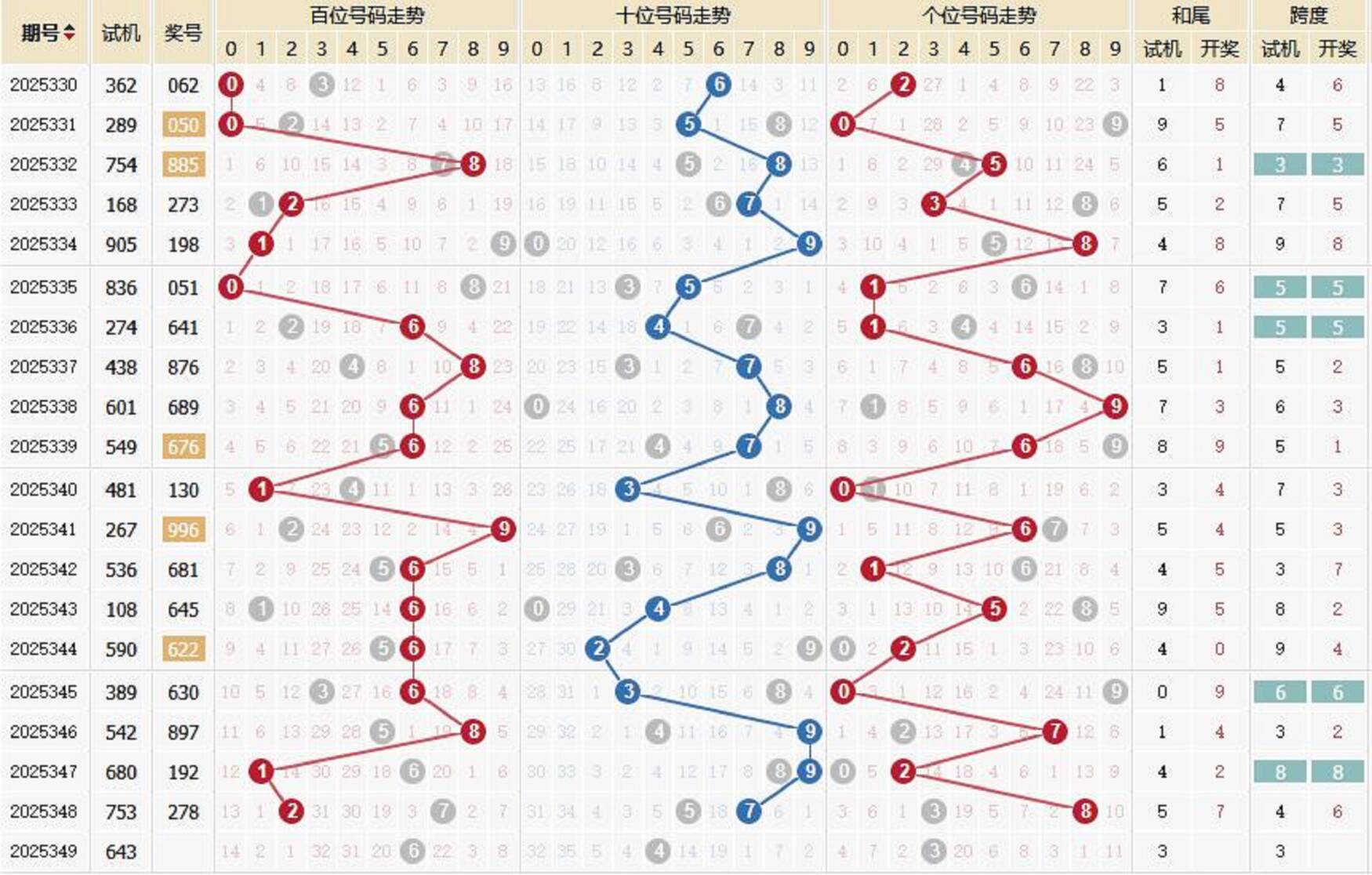 2025349期福彩3D 试 机 号 643 上期开奖号:278 1818部落 关注码:872 金码:2 对应码:811 349试机号形态 试机号:643 和尾:3 跨度:3 大小比:1:2 奇偶比:1:2 试机号走势图 金码历史统计 期数 试机号 关注码 金码 对应码 开奖号 出号 349 643 872 2 811 348 753 926 6 134 278 1 347 680 502 2 300 192 0 346 542 127 1 226 897 0 345 389 764 7 083 630 1 344 590 869 6 717 622 0 343 108 845 4 698 645 0 342 536 317 1 110 681 1 341 267 654 4 952 996 1 340 481 039 9 337 130 1 339 549 718 7 113 676 0 338 601 583 5 926 689 1 337 438 612 2 192 876 1 336 274 978 8 464 641 1 335 836 549 4 929 051 0 334 905 216 2 419 198 1 333 168 308 3 227 273 0 332 754 593 5 155 885 1 历史出现情况统计 349历史开奖号 2002349期 试机号 885 开奖号 985 和 22 349期牛小妹推荐 独胆:6 双胆:56 三胆:156 杀码:49 六码:013568 百位:05 十位:36 个位:18 直组精选: 031 038 061 068 531 538 561 568 单挑:561 更多精选内容: