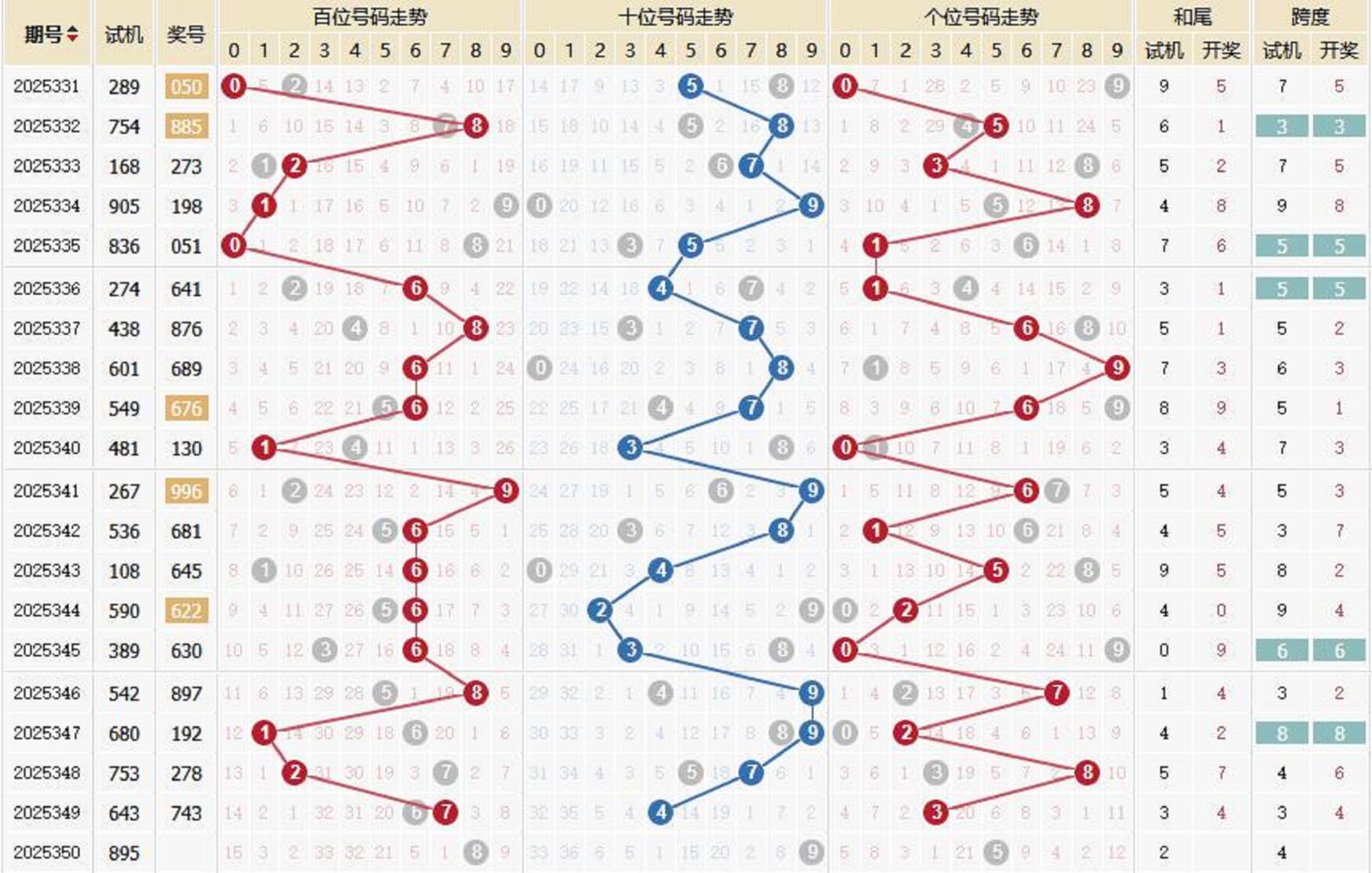 2025350期福彩3D 试 机 号 895 上期开奖号:743 1818部落 关注码:176 金码:6 对应码:517 350试机号形态 试机号:895 和尾:2 跨度:4 大小比:3:0 奇偶比:2:1 试机号走势图 金码历史统计 期数 试机号 关注码 金码 对应码 开奖号 出号 350 895 176 6 517 349 643 872 2 811 743 2 348 753 926 6 134 278 1 347 680 502 2 300 192 0 346 542 127 1 226 897 0 345 389 764 7 083 630 1 344 590 869 6 717 622 0 343 108 845 4 698 645 0 342 536 317 1 110 681 1 341 267 654 4 952 996 1 340 481 039 9 337 130 1 339 549 718 7 113 676 0 338 601 583 5 926 689 1 337 438 612 2 192 876 1 336 274 978 8 464 641 1 335 836 549 4 929 051 0 334 905 216 2 419 198 1 333 168 308 3 227 273 0 332 754 593 5 155 885 1 历史出现情况统计 350历史开奖号 2002350期 试机号 160 开奖号 261 和 9 350期牛小妹推荐 独胆:4 双胆:48 三胆:468 杀码:13 六码:024568 百位:04 十位:26 个位:58 直组精选: 025 028 065 068 425 428 465 468 单挑:468 更多精选内容: