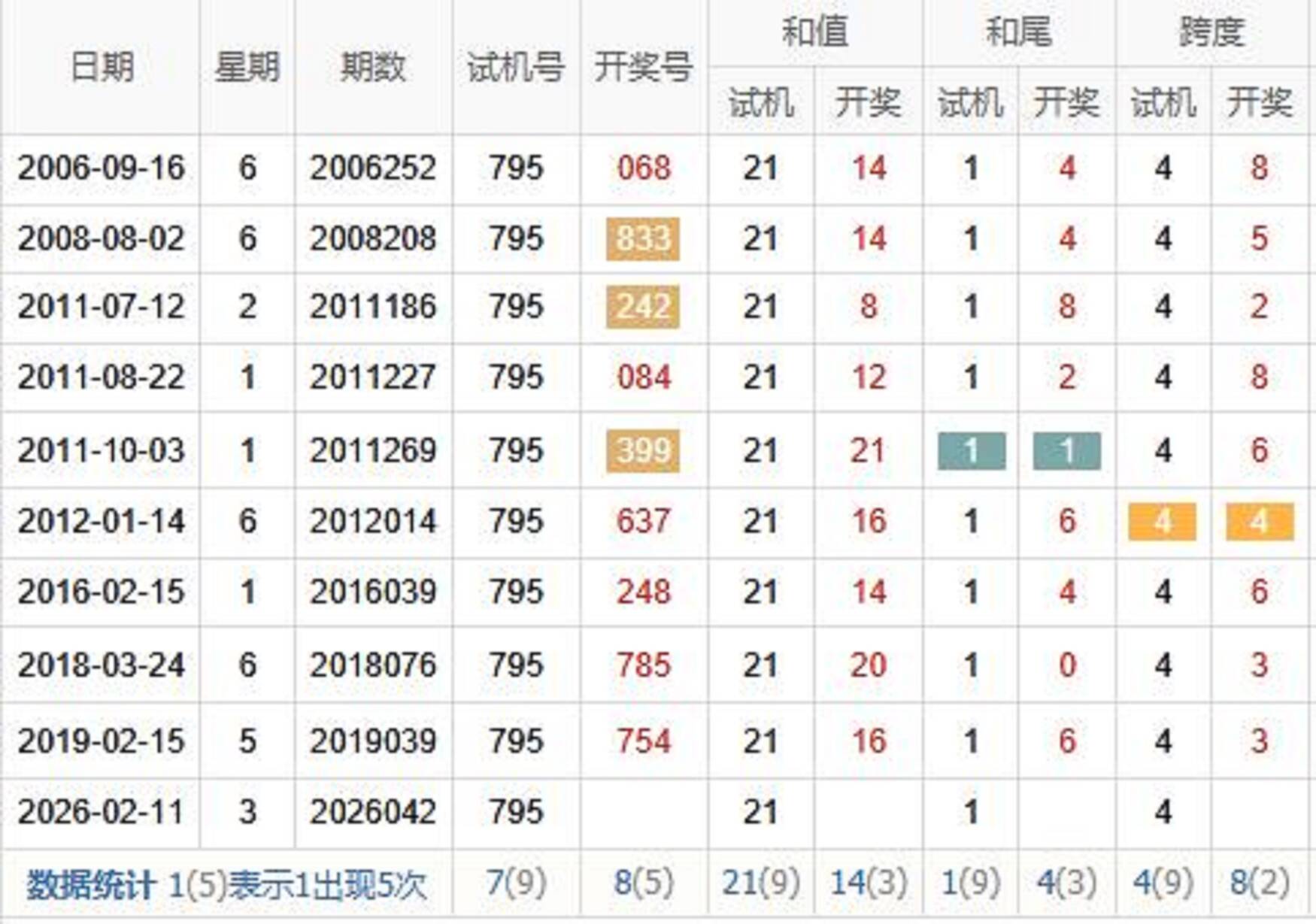 2026042期福彩3D 试 机 号 795 上期开奖号:901 1818部落 关注码:420 金码:0 对应码:437 042试机号形态 试机号:795 和尾:1 跨度:4 大小比:3:0 奇偶比:3:0 试机号走势图 金码历史统计 期数 试机号 关注码 金码 对应码 开奖号 出号 042 795 420 0 437 041 138 953 3 280 901 1 040 469 298 8 232 425 1 039 337 386 6 912 450 0 038 531 672 6 746 467 0 037 624 810 0 331 420 2 036 851 932 3 101 762 0 035 930 164 1 872 213 1 034 687 246 2 636 052 0 033 992 397 7 578 119 1 032 114 836 3 123 452 1 031 945 371 1 899 142 1 030 673 216 2 388 134 1 029 408 572 5 114 003 1 历史出现情况统计 042历史开奖号 2002042期 试机号 522 开奖号 116 和 8 042期牛小妹推荐 独胆:6 双胆:36 三胆:367 杀码:15 六码:023467 百位:46 十位:03 个位:27 直组精选: 402 407 432 437 602 607 632 637 单挑:637 更多精选内容: