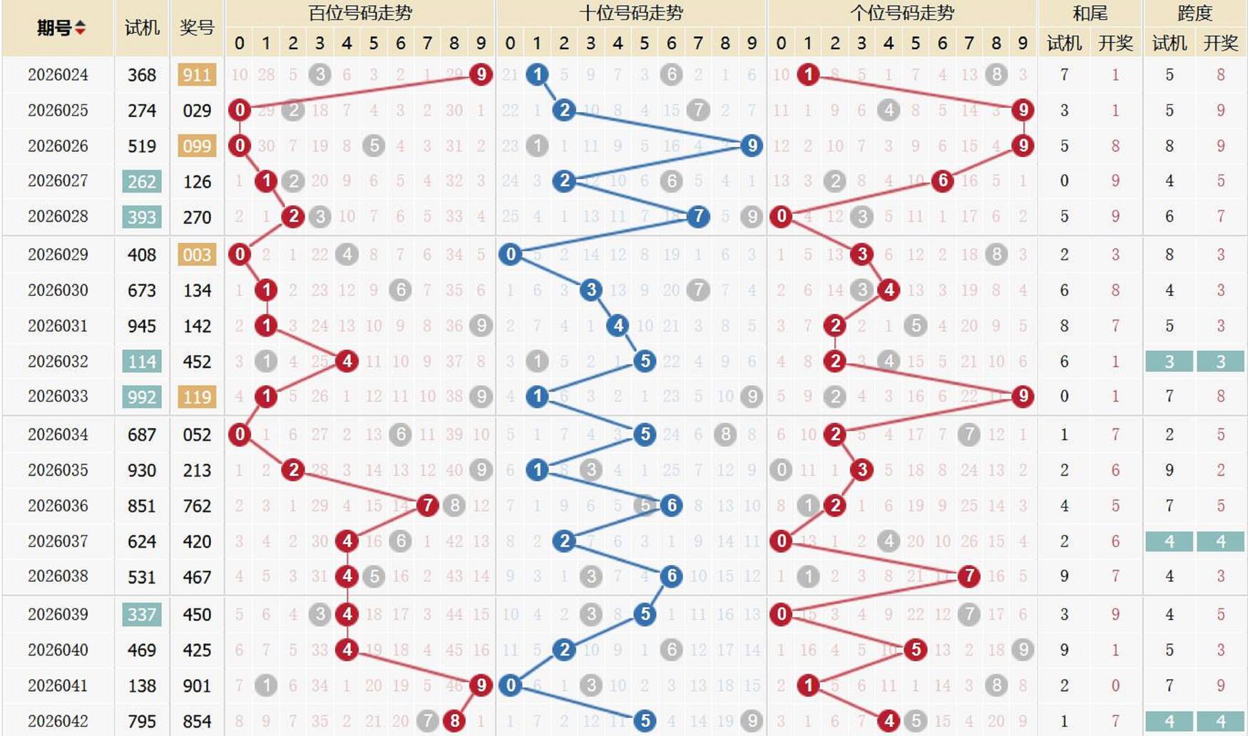 2003043期 试机号 073 开奖号 259 和 16
